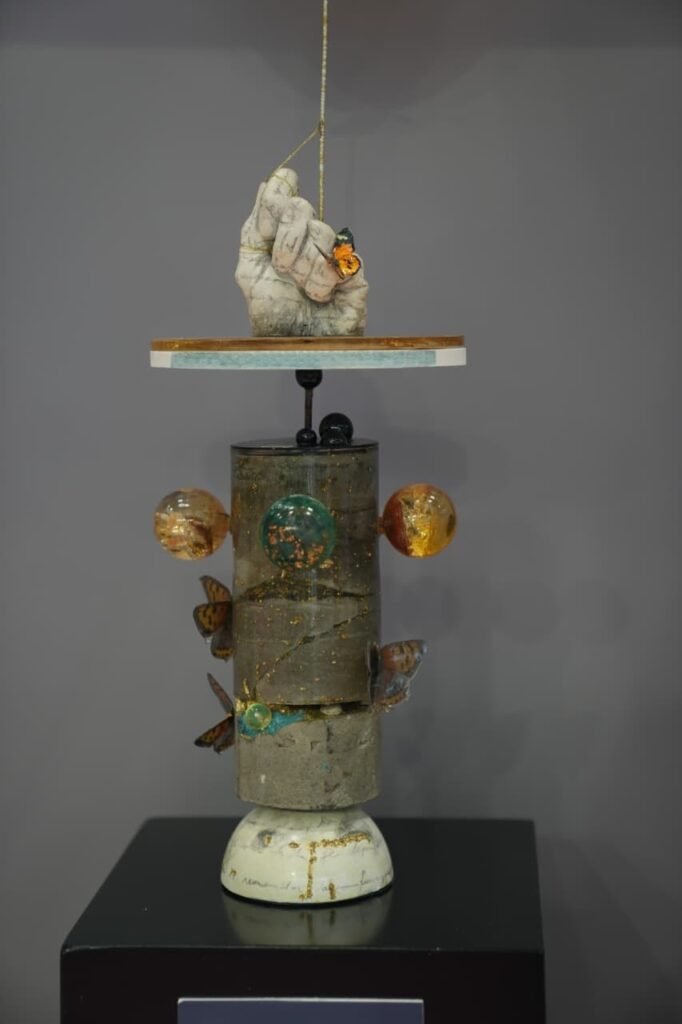 La muestra reúne pinturas, esculturas, collages, fotografías y objetos reciclados elaborados con metales, resinas y cerámicas, donde la artista combina técnicas clásicas y contemporáneas.