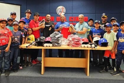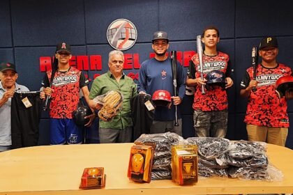 El director provincial de deportes MIDEREC-Santiago, Ramón Antonio Peña Rodríguez (Tony), acompañado del coordinador de béisbol de esa institución, Fausto López, entrega utilería para jugar béisbol, a...